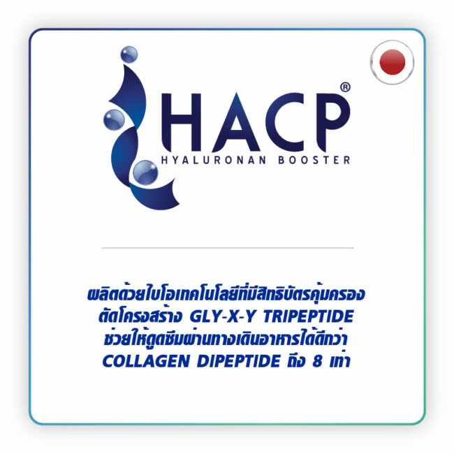 HACP จุดเด่นของสารสกัด ผลิตด้วยไบโอเทคโนโลยีที่มีสิทธิบัตรคุ้มครอง ตัดโครงสร้าง Gly-X-Y Tripeptide ช่วยให้ดูดซึมผ่านทางเดินอาหารได้ดีกว่า Collagen Dipeptide ถึง 8 เท่า ยืนยันประสิทธิภาพในการทำหน้าที่เป็น 1Hyaluron Booster ด้วยงานวิจัยที่ได้รับการตีพิมพ์เป็นของตนเอง ขนาดรับประทานที่เห็นผลในการดูแลสุขภาพผิว เพียง 1 กรัมต่อวัน ยืนยันด้วย 4 ดัชนีชี้วัดประสิทธิผล ช่วยเพิ่มความชุ่มชื้นของผิว 7.4 เท่าใน 6 สัปดาห์ ช่วยเพิ่มความยืดหยุ่นให้ผิวสูงขึ้น 5.3 เท่า ใน 12 สัปดาห์ ช่วยลดความหยาบกร้านของผิวลง 6.8 เท่า ใน 12 สัปดาห์ ช่วยลดรอยตีนกาลง 11.5 เท่า ใน 12 สัปดาห์สนใจข้อมูลนวัตกรรมและงานวิจัยเพิ่มเติม <<< ความงาม ผิวพรรณ เส้นผม | ดูแลสุขภาพ ข้อ เข่า กระดูก