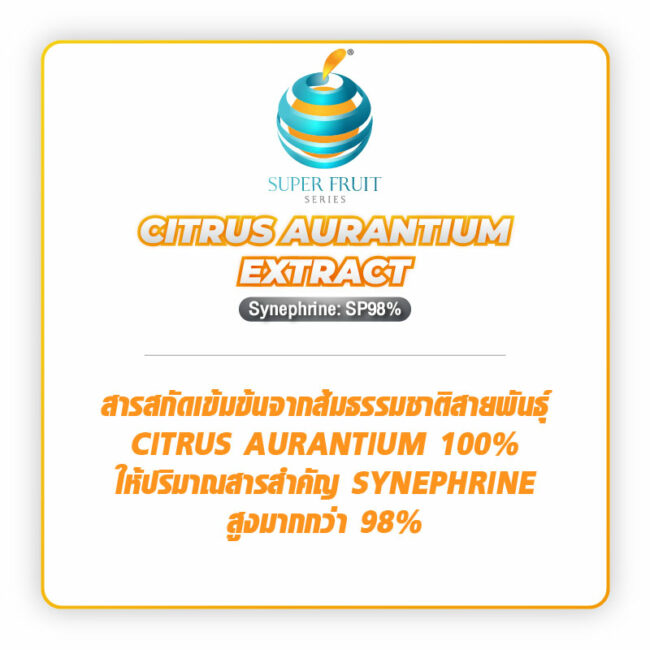 Super Fruit : CITRUS AURANTIUM EXTRACT จุดเด่นของสารสกัด สารสกัดเข้มข้นจากส้มธรรมชาติสายพันธุ์ CITRUS AURANTIUM 100% ให้ปริมาณสารสำคัญ Synephrine สูงมากกว่า 98%ประสิทธิผล เพิ่มอัตราการเผาผลาญไขมัน ขณะออกกำลังกายได้สูงสุด 57.1% เพิ่มอัตราการเผาผลาญพลังงานขณะพักสูงขึ้น 2 เท่า เพิ่มประสิทธิภาพการออกกำลังกายและความทนทานของกล้ามเนื้อ ช่วยให้ควบคุมความอยากอาหารได้ดีขึ้น 5.6%สนใจข้อมูลนวัตกรรมและงานวิจัยเพิ่มเติม <<< ความงาม ดูแลรูปร่าง ควบคุมน้ำหนัก | โปรตีน ทดแทนมื้ออาหาร ส่งเสริมการออกกำลังกาย เสริมกล้ามเนื้อ
